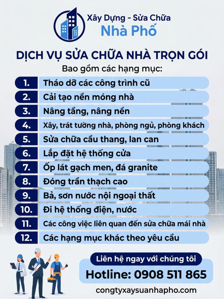 Nếu anh/chị đang cần tìm hiểu sửa chữa nhà trọn gói tphcm, bài viết này sẽ giúp anh/chị có cái nhìn đầy đủ hơn: từ khái niệm dịch vụ, các hạng mục phổ biến, cách tính giá, những yếu tố ảnh hưởng đến chi phí cho đến kinh nghiệm chọn công ty sửa nhà uy tín tphcm để yên tâm khi triển khai.