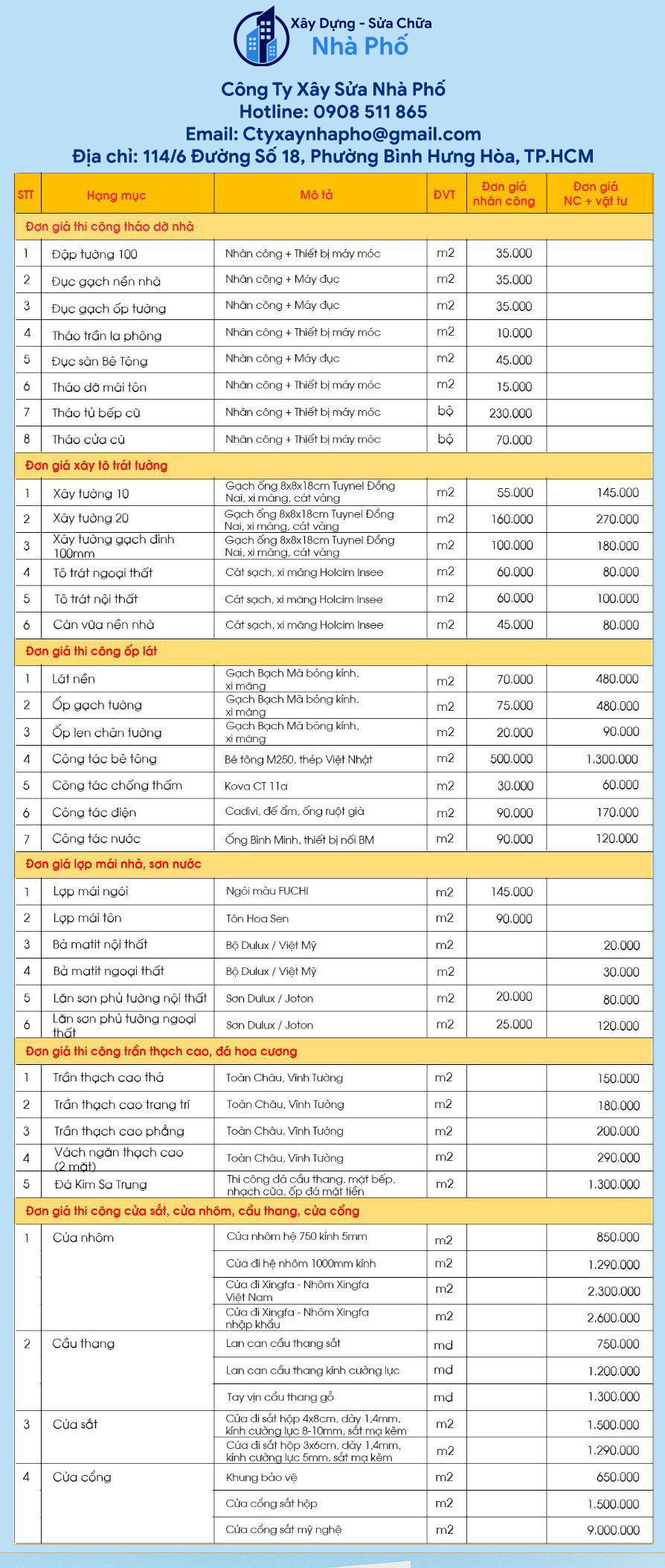 | Hạng mục | Đơn giá (VNĐ/m²) |